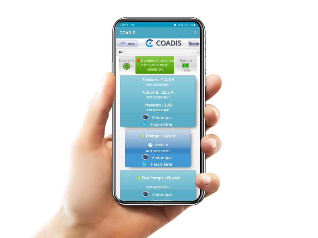 La solution garde la traçablité des opérations effectuées (Marche/Arrêt) et l'historique de l'état réel de la pompe avec la tension et le courant (s'ils existent) ce qui aide l'utilisateur à mieux organiser l'irrigation